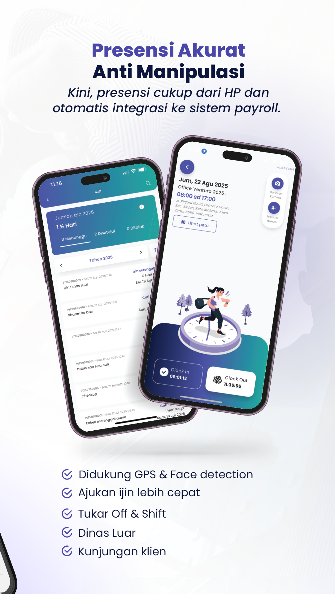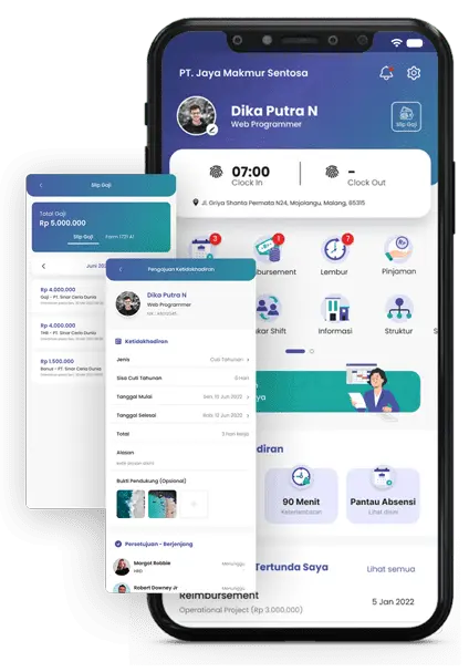 Kelola absensi karyawan dengan software absen HRIS yang efisien dan akurat, dilengkapi fitur pelacakan lokasi berbasis GPS untuk mencegah manipulasi data kehadiran.